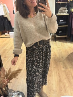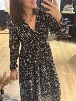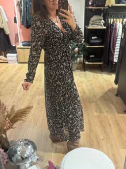 Robe en voile Décolleté col V Fond noir et fleurs marrons Fil...