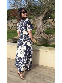 Robe longue forme cache coeur Imprimé fleuri bleu marine...