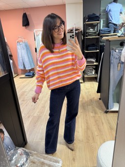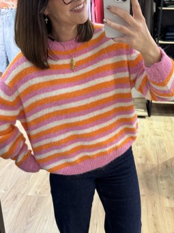 Pull col rond à rayures Ton rose, blanc, orange S/M M/L